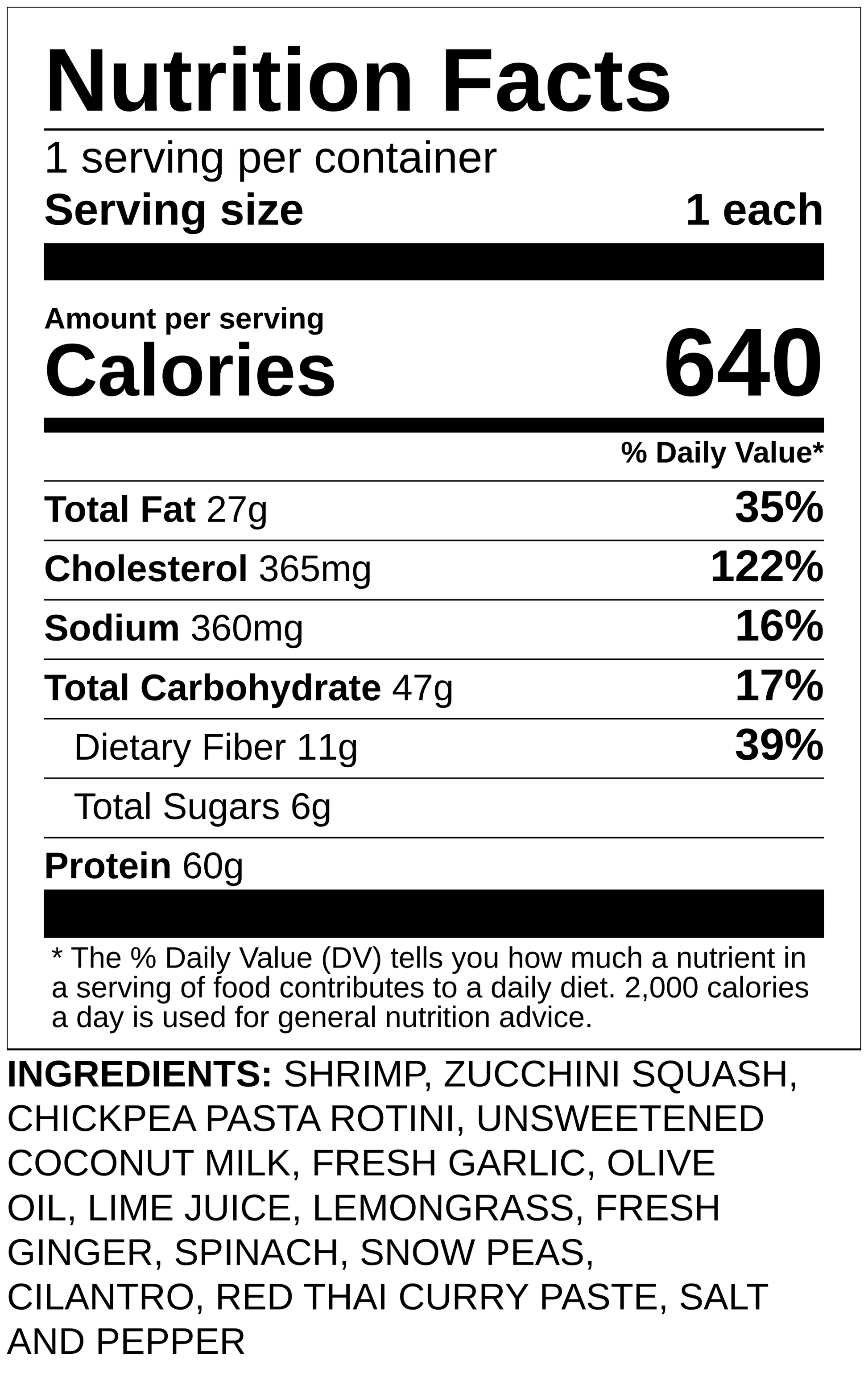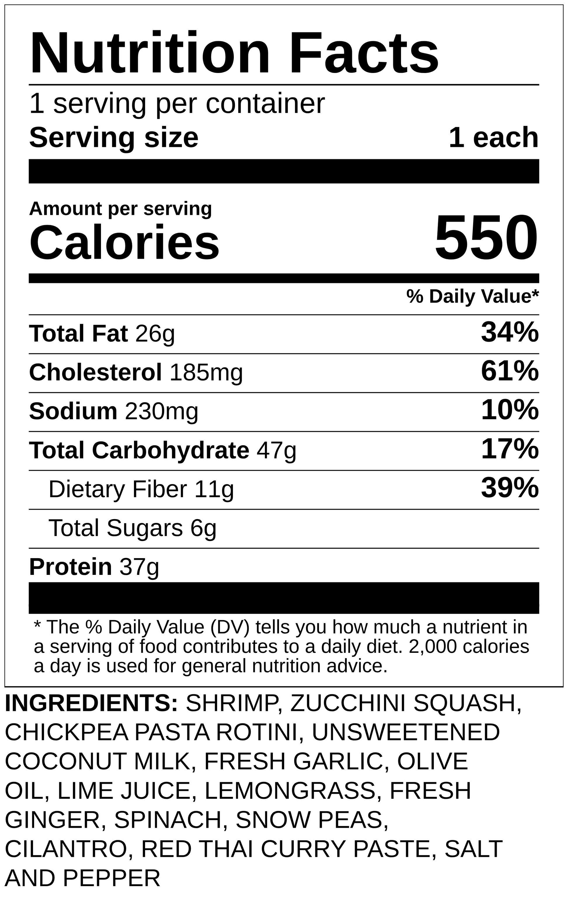 Succulent shrimp simmered in a creamy coconut lemongrass sauce, served with crisp snow peas and protein-packed chickpea pasta. A delightful fusion of aromatic flavors and wholesome ingredients.